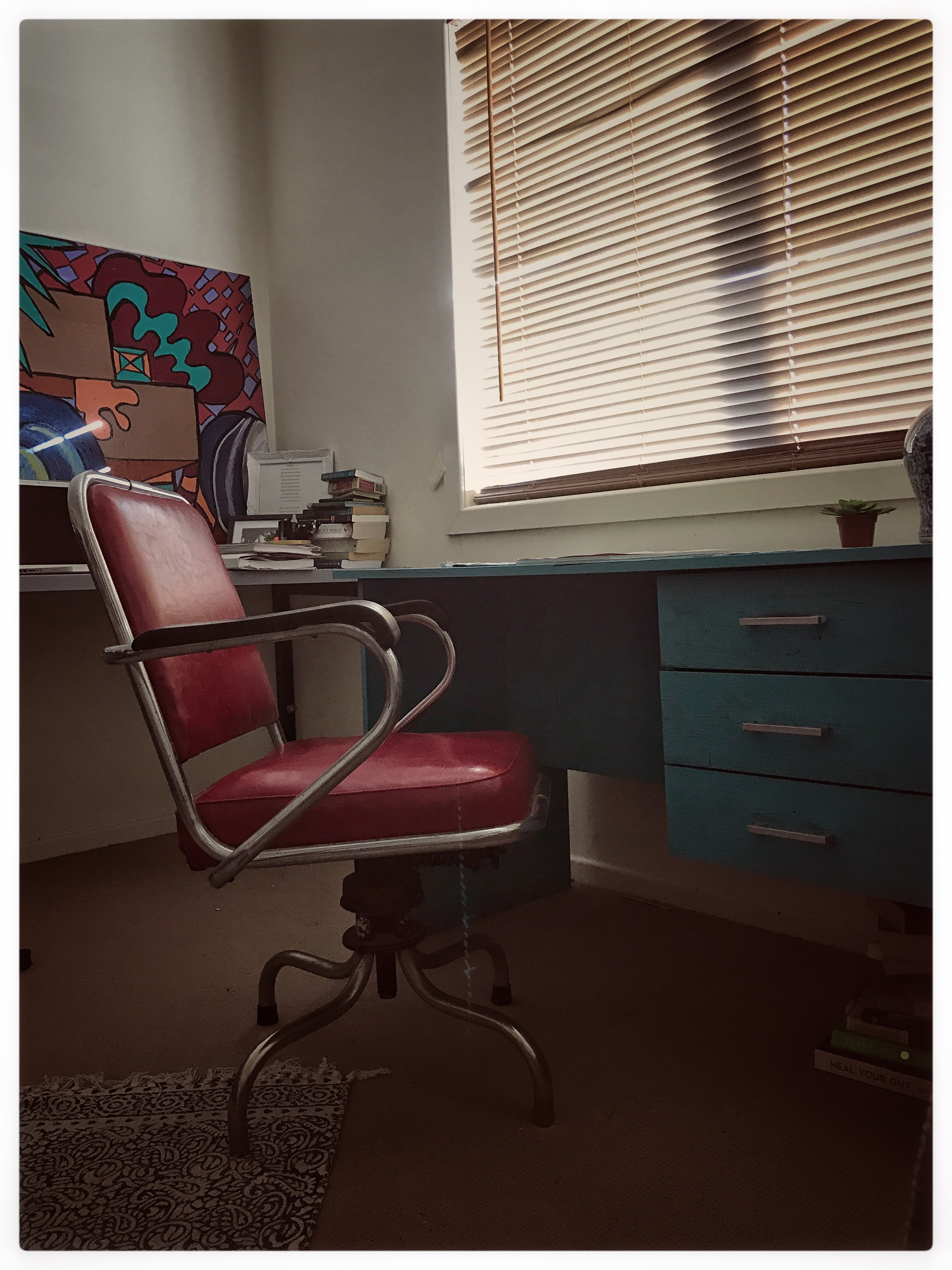 A desk – which used to be a cheap old knocked about dark chocolate veneer finish has been given a vintage vibe and freshen up with green.