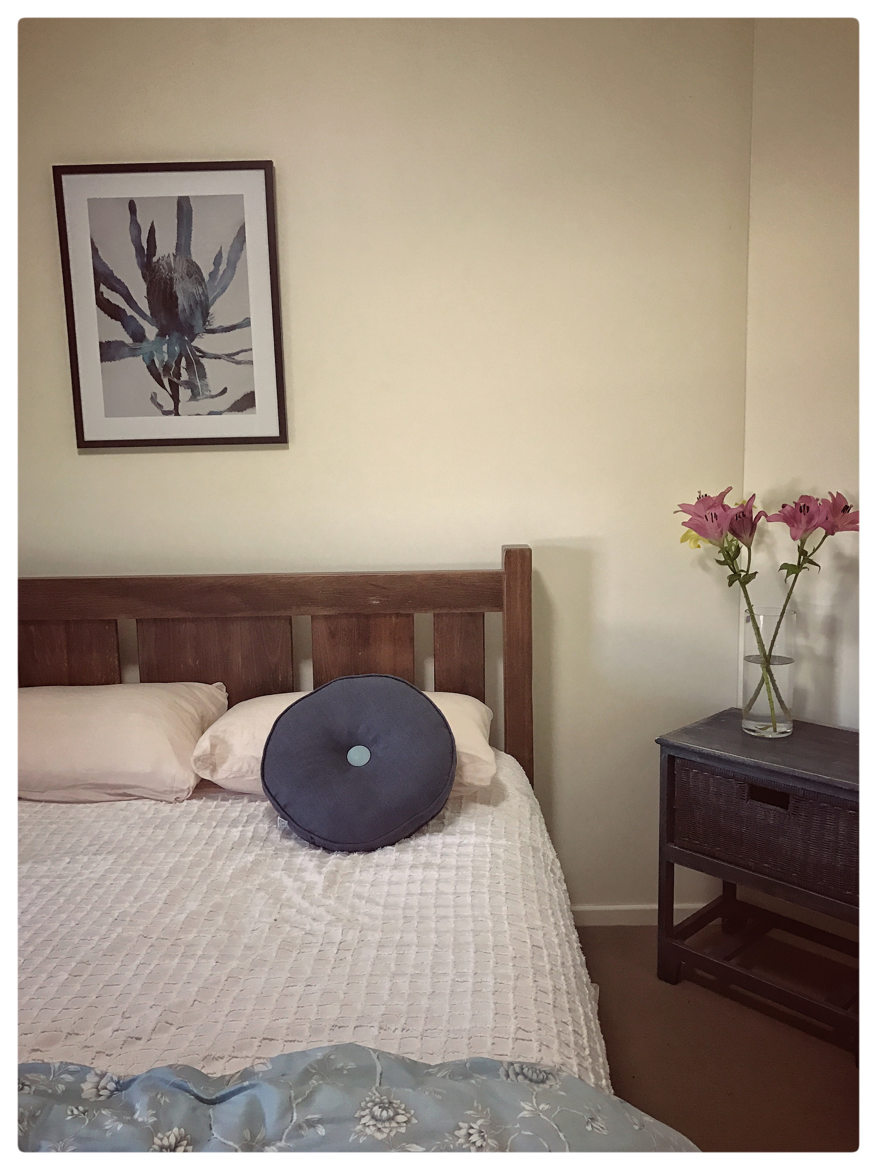 An old white cane cabinet was painted navy with a distressed finish and is now a welcome addition to the guest room which needed a bedside table.