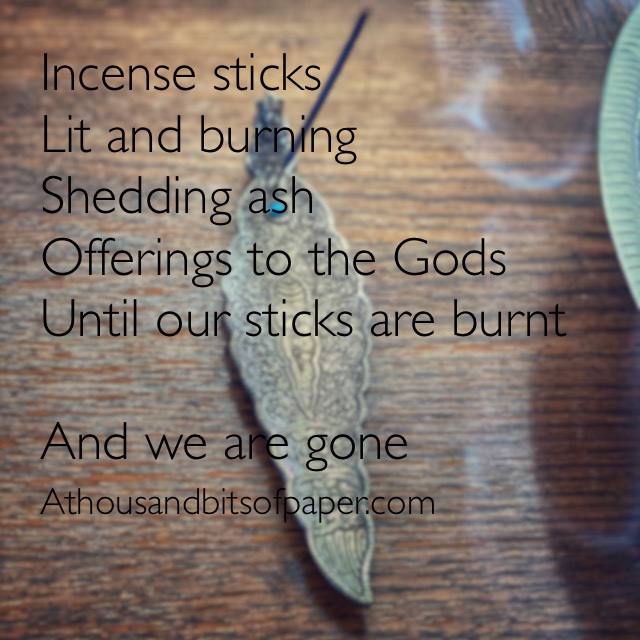 I spent the week-end asking myself questions. There is nothing like concern for someone you love to make you pound the “what if ” keys like a heavy metal rocker… It was certainly noisy in there Desiring peace, I leant on my new incense habit until my hair smelt like a gypsy. Realising that it […]